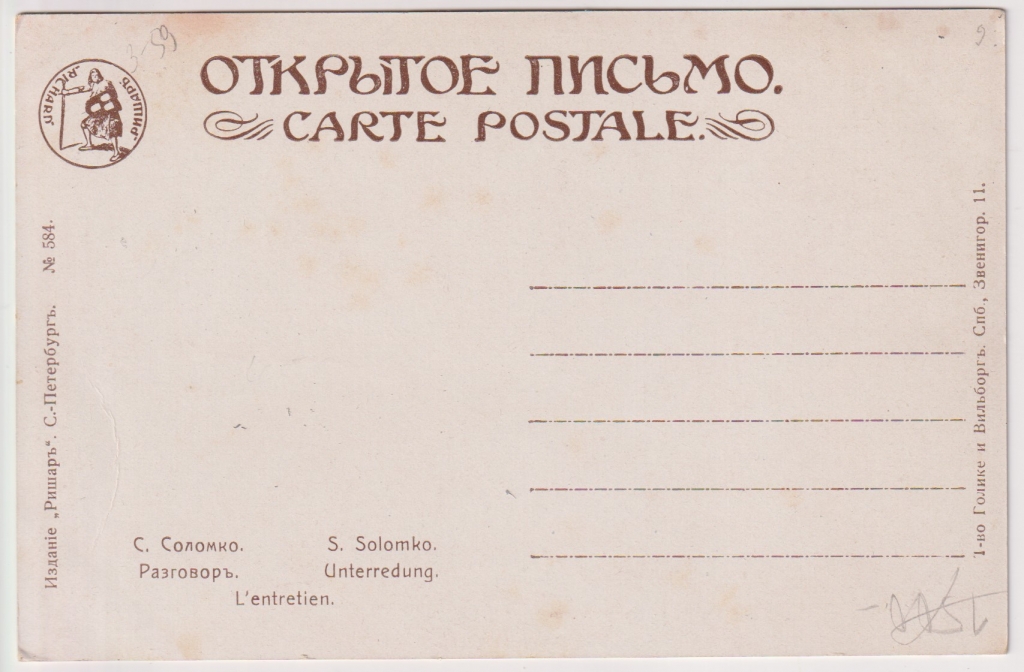 Главная - Каталог - Старинные открытки - Открытки. Новые поступления. - New Разговор Соломко Открытое письмо Ришар СПб