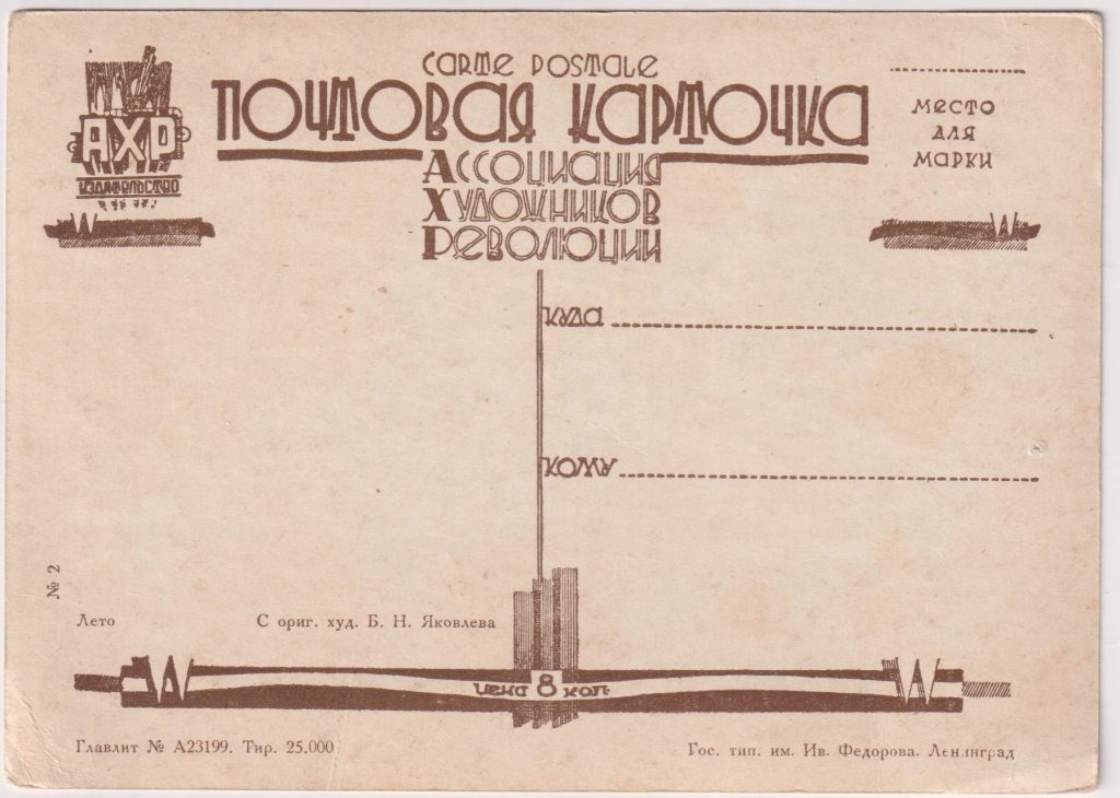 Главная - Каталог - Старинные открытки - Открытки. Новые поступления. - New Лето С ориг. худ. Б.Н. Яковлева Почтовая картчока Изд-е АХР №2