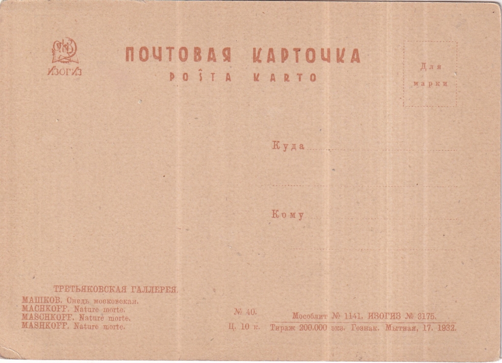 Главная - Каталог - Старинные открытки - Старинные открытки с натюрмортами - Снедь Московская Машков Почтовая карточка Изогиз 1932
