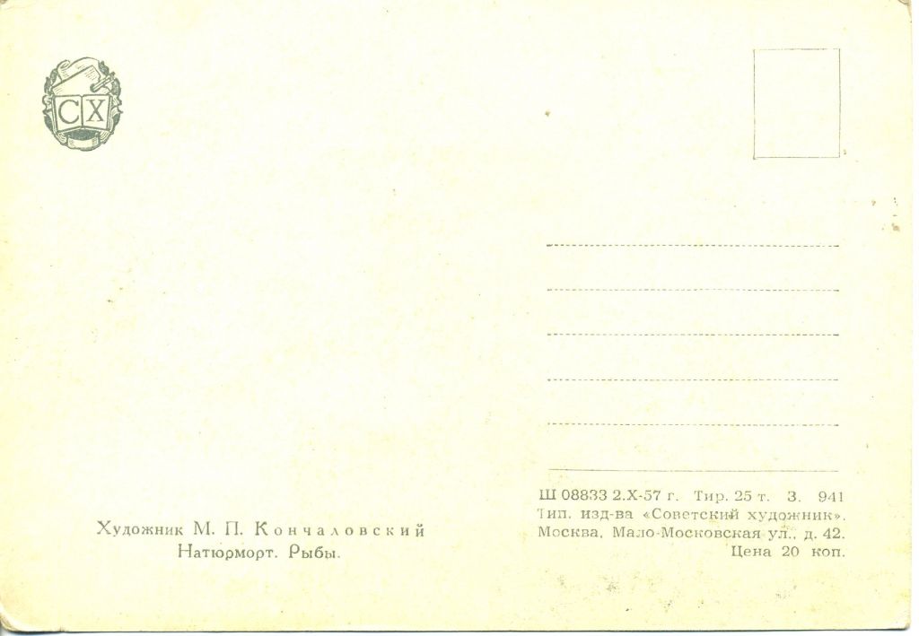 Главная - Каталог - Старинные открытки - Старинные открытки с натюрмортами - Открытка СХ 1957 Рыбы Кончаловский