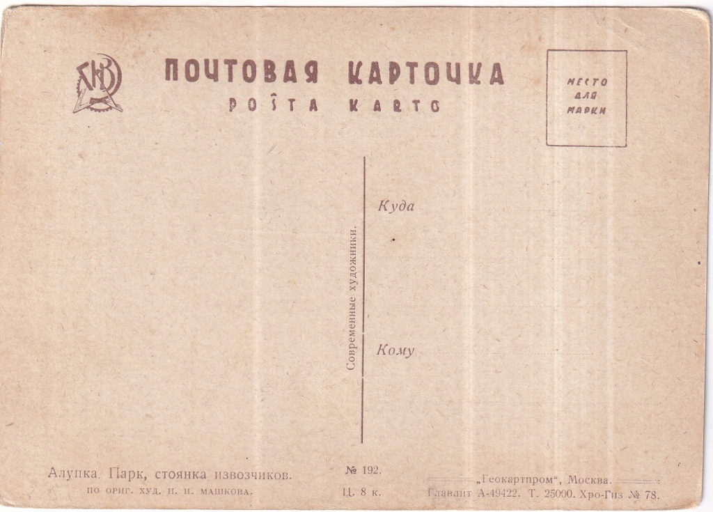 Главная - Каталог - Старинные открытки - Открытки. Соцреализм. Живопись. АХР - Алупка Парк Стоянка извозчиков Машков Почтовая карточка ГИЗ