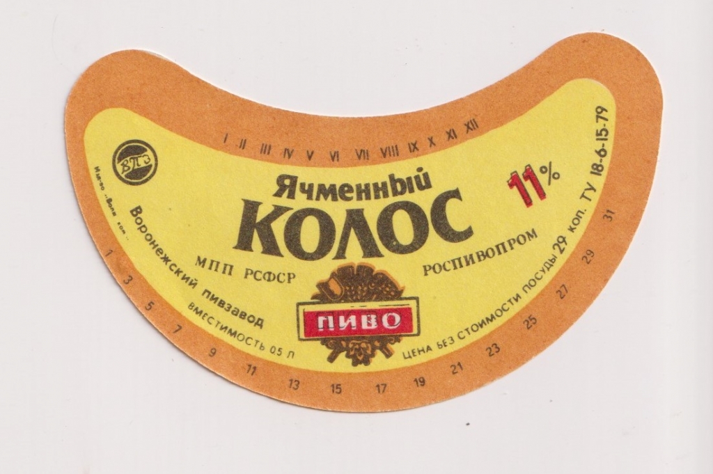 Этикетка пиво "Ячменный колос". Воронежский пивзавод.