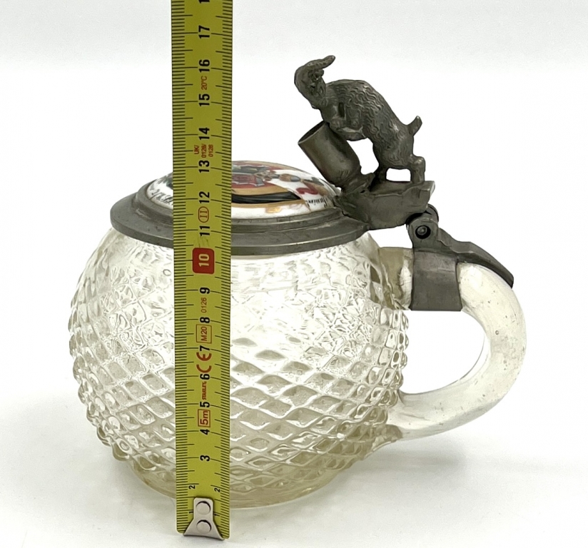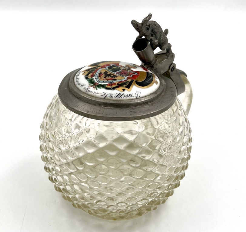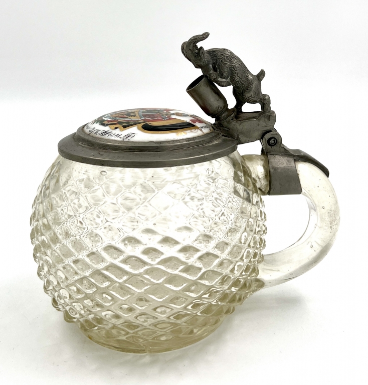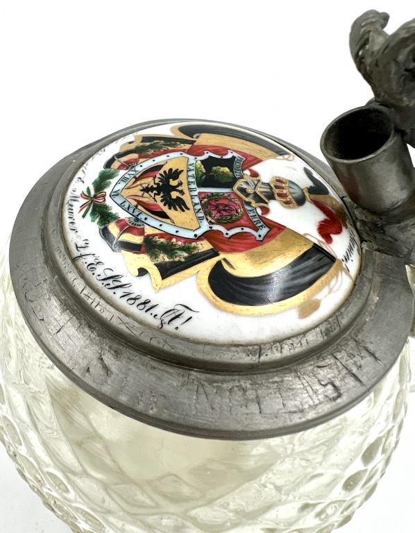 Пивная кружка студента Братства "Алеманния Штуггарт". Германия 1881 г. Стекло, олово, роспись эмалями.