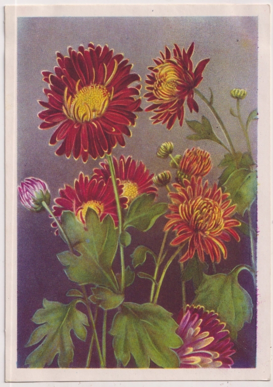 Главная - Каталог - Старинные открытки - Открытки с цветами и фруктами - Корейская гибридная хризантема. Открытое письмо. Главкультторг. 1956 г.