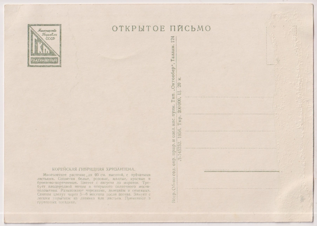 Корейская гибридная хризантема. Открытое письмо. Главкультторг. 1956 г.